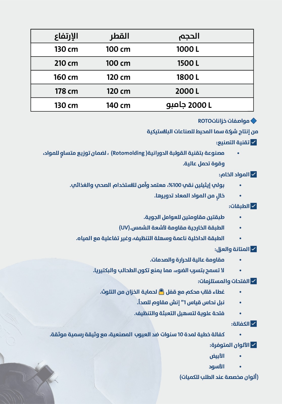 ROTO tanks by Sama Al-Muheet are lightweight, easy to install, and ideal for storing water and other liquids. They guarantee complete leak-proof performance, making them the perfect choice for reliable storage solutions.